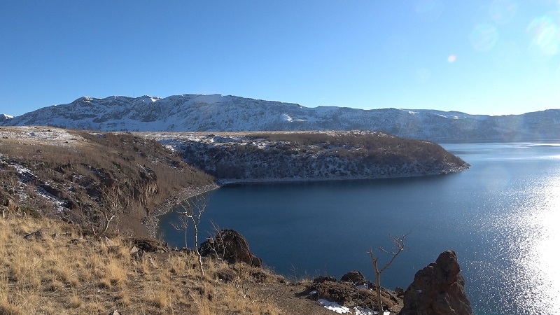 Bitlis’in Tatvan ilçesinde bulunan Nemrut Krater Gölü ziyaretçilerine iki mevsimi bir arada yaşatıyor.