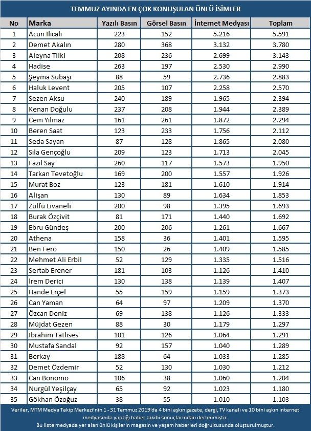 Medya Takip Merkezi (MTM), Temmuz ayını kapsayan araştırmasında öne çıkan magazin olayları ve ayın popüler ünlülerini belirledi. Birbirinden çarpıcı gelişmelerin yaşandığı ayda Acun Ilıcalı zirvedeki yerini korurken eski eşi Şeyma Subaşı çıkarmış olduğu S